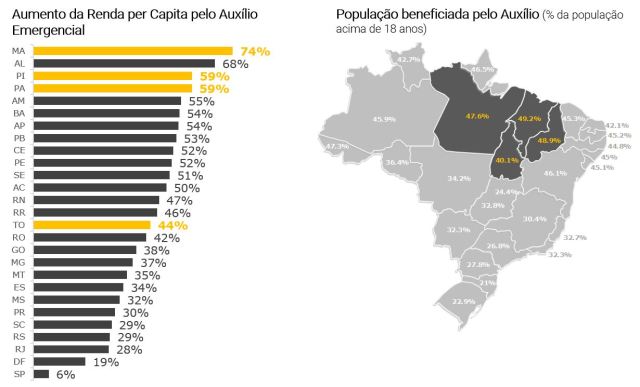 De fato, o Norte e Nordeste foram as regiões onde o benefício teve o maior alcance, com cerca de 45% da população beneficiada pelo benefício comparado com 25-30% nas regiões Sul e Sudeste. Nós tentamos estimar a magnitude desse impacto e encontramos que os Estados onde o Mateus tem operações estão dentre os mais beneficiados, com o auxílio aumentando a renda per capita em 60-75% entre Abril e Agosto.