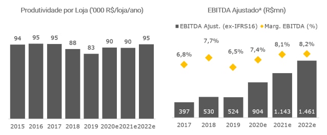 - EBITDA: esperamos que a margem EBITDA tenha uma expansão de 1,7p.p. nesse período, com a queda nas margens brutas por conta da mudança no mix de formatos sendo compensada por ganhos de alavancagem operacional juntamente com diluição das despesas de aluguel dado que 50-60% da expansão será feita via lojas próprias. Como resultado, esperamos que a margem EBITDA Ajustada consolidada (ex-IFRS16 e subtraindo a taxa de desconto do lojista) atinja 8,5% em 2025 (de 7,4% em 2020e).