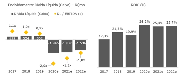 - Fluxo de Caixa Livre: esperamos uma baixa geração de caixa no curto prazo, por conta dos altos investimentos em expansão de lojas, com 2021-22e pressionados também por investimentos em novos Centros de Distribuição (~R$ 450 milhões). No entanto, projetamos uma geração de caixa sólida a partir de 2023, com conversão de Fluxo de Caixa / EBITDA entre 30%-60%. Quanto à alavancagem, o Grupo Mateus deve permanecer caixa líquido no futuro próximo.