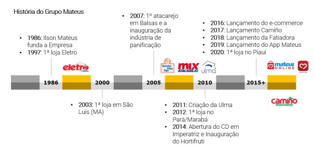 O Grupo Mateus é a 4ª maior rede de supermercados do Brasil, com aproximadamente 3% de participação de mercado, R$ 14 bilhões em vendas brutas anuais (2020e) e 150 lojas nas regiões Norte e Nordeste. A empresa nasceu em São Luís (Maranhão), fundada pelo Sr. Ilson Mateus, ex-torneiro mecânico, garimpeiro e vendedor de cachaça. O Sr. Ilson iniciou suas operações por meio de uma mercearia em 1986, que posteriormente se expandiu para atacado e varejo (a primeira loja foi inaugurada em 2003). Em 2007, a empresa verticalizou sua atuação no setor de panificação por meio do “Bumba meu Pão” e ingressou no Atacarejo através da bandeira Mix Atacarejo. Em 2009, foi inaugurado o primeiro Eletro Mateus, marcando a entrada no segmento não alimentar e, em 2011, foi lançado o Mateus Card em parceria com o Banco Bradesco. Em 2012, a empresa iniciou sua expansão para fora do Maranhão, abrindo lojas no estado do Pará. Por fim, a empresa lançou um e-commerce em 2016 focado principalmente em foodservice e lançou seu aplicativo e seu e-commerce de produtos não alimentares em 2017.