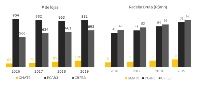Um prêmio merecido vs. comparáveis. No nosso preço alvo, GMAT negociaria a 25,4x P/L, um prêmio aos comparáveis, o que vemos como justo. Depois de levantar quase R$3bn com o seu IPO, a companhia está pronta para acelerar sua expansão para outros estados da região, com o objetivo de mais que duplicar o número de lojas até 2025 para 325 lojas, comparado com 145 hoje. Dessa forma, estimamos um crescimento médio anual de receita em 26% entre 2019 e 2024, explicado principalmente pela abertura e maturação de lojas. Nós também estimamos que a margem EBITDA ajustada expanda 1,7 p.p. até 2024, decorrente de alavancagem operacional. Com isso, estimamos um crescimento médio anual de lucro de 39% entre 2019 e 2024. Isso se compara a um crescimento de receita e lucro de 9%-25% para o Carrefour e 16%-22% para GPA, respectivamente. Se ajustarmos os múltiplos de P/L no preço alvo pelo crescimento de lucro esperado entre 2019-24e, Grupo Mateus estaria negociando a um P/L ajustado pelo crescimento de 0,65x, um desconto de 15% aos seus comparáveis.