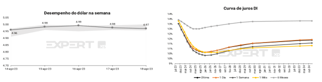 No Brasil, o destaque da próxima semana será a divulgação do IPCA-15 de agosto na sexta-feira. A projeção da XP aponta para alta de 0,12% m/m. O mercado estará vigilante às métricas dos preços de serviços, serviços subjacentes (mais ligados à atividade econômica) e núcleos (expurgam itens voláteis). Também na sexta-feira, haverá a divulgação das contas externas brasileiras pelo Banco Central. Na seara política, é esperado acordo entre líderes da Câmara dos Deputados e Ministério da Fazenda para a aprovação do arcabouço fiscal. Está marcada uma reunião para segunda-feira em que se discutirão os detalhes da votação. Segundo Arthur Lira, Presidente da Câmara, se um acordo for atingido, é possível que a proposta seja votada já na terça-feira. Além disso, é esperado que se vote a MP 1172, que garantiu o aumento do salário-mínimo para R$ 1.320,00 em 1º de maio e determinou a taxação de investimentos feitos por empresas e fundos fora do país.