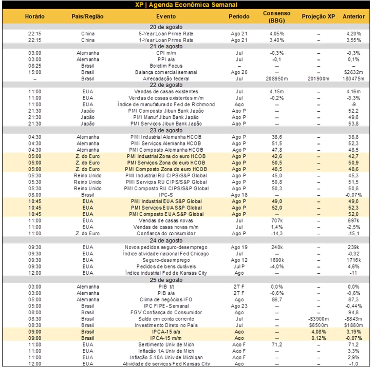 No cenário internacional, semana de prévias dos PMIs (índices de gerentes de compras) nas principais economias desenvolvidas. Na China, o banco central deve reduzir suas taxas de empréstimos de 1 ano e de 5 anos no domingo e, a depender do grau de ajuste e da comunicação oficial, o mercado pode reagir de maneira relevante.