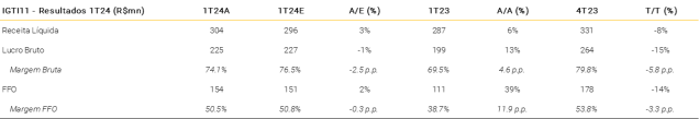 A receita líquida atingiu R$304 milhões (+6% A/A), marginalmente acima de nossas estimativas (+3% vs. XPe), beneficiada por (i) fortes receitas de estacionamento em +24% A/A (+8% vs. nós); e (ii) sólido aluguel temporário (+19% A/A), apesar de aluguel mínimo estável A/A, prejudicado por (i) efeito de ajuste do IGP-DI sob pressão (+0,4% no 1T24); e (ii) menor ABL no Market Place, dada a revitalização.