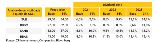 O dividend yield deve ajudar a longo prazo. Como uma indústria madura, não acreditamos que os bancos possam empregar grandes quantidades de capital incremental a taxas de retorno muito altas durante um período prolongado, o que afeta negativamente o nosso preço-alvo. Por outro lado, consideramos nossas estimativas de dividend yield de 8,2 a 12,6% de 2021 a 2023 (incluindo JCP) como atrativas, especialmente com o atual patamar de juros.