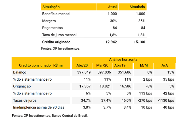 Empréstimos consignados poderiam ser beneficiados. Um projeto de lei visa aumentar a porcentagem do benefício que pode ser usado como pagamento para empréstimos consignados. Hoje bancos podem cobrar até 30% do benefício de uma pessoa como pagamento pelo empréstimo consignado, cujo valor pode aumentar para 35%. Por que isso Importa? A porcentagem do benefício que pode ser usada como pagamento é o fator mais importante para calcular quanto os bancos podem conceder aos clientes. Com o aumento das margens e tudo o mais, os bancos podem aumentar as concessões em até 17%, o que é especialmente importante quando os empréstimos consignados são: i) a maior linha de crédito para pessoas físicas, representando 11% do total crédito de mercado; ii) atraente em momentos de crise devido a ao baixo índice de inadimplência de 3,8%; e iii) sua taxa de juros agora é atraente quando comparada à atual política monetária com a SELIC em seus menores níveis históricos de 3%.