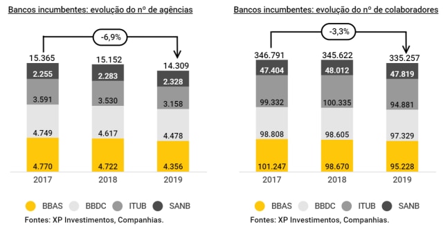 Novos entrantes digitais ganharam escala. Por meio de apenas um aplicativo móvel, o Nubank alcançou clientes em todos os 5.570 municípios brasileiros, tem acesso a captação barata e consegue distribuir seus produtos aos seus mais de 25 milhões de clientes; tudo através do aplicativo, onde o banco tem a maior penetração no sistema Android, bem como o maior número de downloads e usuários ativos mensais. O Nubank, por exemplo, alcançou essa escala sem o ônus de investir em agências físicas e contratar 100 mil funcionários. Da mesma forma, o Banco Inter atingiu um custo de captação de 58% do CDI, tem apenas 1,6 mil funcionários e nenhuma agência (vs. custo de captação de 83% do CDI do Banco do Brasil que conta com uma estrutura de 95 mil funcionários e 4,4 mil agências e postos de atendimento).