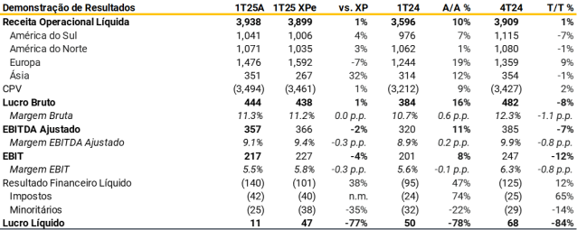 Faturamento. A receita líquida de R$ 3,9 bilhões ficou em linha com nossas estimativas (+10% A/A e +1% T/T) em meio a um trimestre sazonalmente mais fraco, com (i) sólido desempenho no Brasil (vendas +7% A/A refletindo melhores volumes) e (ii) efeitos positivos da variação cambial (impacto de R$ 399 milhões no trimestre) compensando (iii) atividade mais lenta da Europa e América do Norte. Notamos um desempenho relativamente melhor dos produtos relacionados a veículos leves, com um crescimento consolidado de +6% A/A vs. uma queda de -8% A/A na categoria de veículos comerciais, com componentes estruturais na América do Norte como o destaque negativo (-10% A/A).