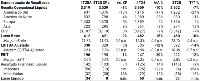 Receitas. A receita líquida foi de R$3,5 bilhões, desacelerando em linha com nossas estimativas em meio à fraca sazonalidade e níveis desfavoráveis de USDBRL. Observamos: (i) contração maior do que o esperado na América do Sul (receitas de -17% A/A), ponderada pela produção fraca de veículos pesados até o final do ano (parcialmente compensada pelo desempenho consistente de veículos leves); e (ii) uma recuperação consistente na Europa (+5% A/A e T/T), refletindo os ganhos de participação de mercado da Iochpe; Enquanto isso, (iii) a América do Norte mostrou sinais de estabilização, com Iochpe destacando um ambiente ligeiramente melhor em relação ao 3T25 (embora as receitas ainda tenham contraído -23% A/A e -11% T/T).