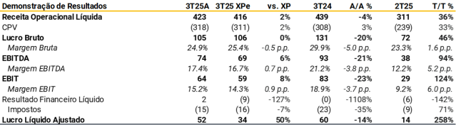 A Kepler Weber apresentou resultados neutros no 3T25, com EBITDA de R$ 74 milhões, -21% A/A e +94% T/T, em linha com a sazonalidade naturalmente mais forte neste trimestre e ligeiramente acima de nossas estimativas (embora parte do beat possa ser explicado por ganhos fiscais pontuais neste trimestre). Continuamos a ver um ambiente de demanda desafiador, com altas taxas de juros e preços mais fracos de commodities agrícolas continuando a pesar sobre a rentabilidade dos produtores, impulsionando vendas mais fracas de Agronegócio e Fazendas, parcialmente compensadas pelo sólido desempenho de vendas internacionais e de R&S, resultando em uma queda de -2% na receita líquida. Dito isso, vemos a rentabilidade como destaque, com margem EBITDA de 17,4% (vs. XPe de 16,7%), apoiada por aceleração das entregas e iniciativas para aprimorar a disciplina de custos e o equilíbrio do portfólio. Em suma, embora os desafios de curto prazo persistam, continuamos construtivos nos esforços comerciais da empresa para fortalecer a resiliência, com a Kepler bem posicionada para quando as taxas de juros se normalizarem e o ciclo virar.