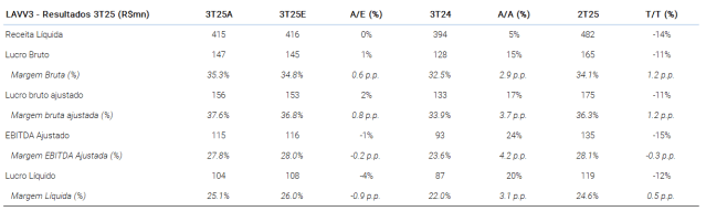 A Lavvi divulgou resultados positivos para o terceiro trimestre de 2025, em linha com as expectativas. Os principais destaques incluem: (i) expansão positiva da receita de 5% A/A, apesar da queda nas vendas líquidas A/A, apoiada pelo sólido reconhecimento do backlog (receita a apropriar); (ii) margens brutas aumentando para 35,3% (+60 pontos base em relação ao XPe), refletindo o reconhecimento de projetos mais novos e com margens mais altas, que também apoiaram a expansão das margens do backlog. (iii) EBITDA de R$ 115 milhões (+24% A/A), em linha com nossas estimativas, ajudado pelo crescimento positivo das margens backlog, apesar das despesas comerciais ligeiramente mais altas, (iv) lucro líquido de R$ 104 milhões (+20% A/A), levando a um ROE de 29% nos últimos 12 meses, o que consideramos robusto em relação aos pares, e (v) alavancagem financeira estável e saudável de 4% dívida líquida/patrimônio líquido, apoiada pela redução dos desembolsos de caixa. Não esperamos uma reação significativa das ações, mas mantemos nossa recomendação de compra e preço-alvo para o final do ano de 2026 de R$ 17,0/ação.