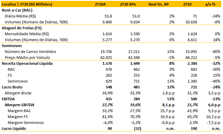 Apesar do cenário desafiador, a Localiza reportou resultados acima das expectativas de forma geral. Excluindo os R$ 126,3 milhões referentes à reversão da provisão para créditos de PIS e COFINS, o EBITDA ajustado foi de R$ 309 milhões (o que se compara com nossa expectativa de R$ 284 milhões), e o prejuízo líquido foi de R$ 36 milhões (ante expectativa de R$ 32 milhões). Os números também ficaram acima do consenso da Bloomberg. A diferença para nossos números se deu por (i) dados melhores que o esperado tanto no segmento de RAC (aluguel de carros) quanto Fleet (gestão de frotas), em termos de volume e também de margens ajustadas, (ii) vendas de Seminovos superiores ao esperado (19,7 mil vs. uma expectativa de 17,2 mil), mas que foram parcialmente compensadas por (i) uma margem em Seminovos ligeiramente abaixo da nossa estimativa (-4% vs. expectativa de -3,2%) e (ii) resultados financeiros mais pressionados que o projetado (~9% acima da nossa expectativa de R$ 117 milhões).