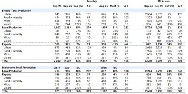 A FABUS divulgou seus dados de produção de carrocerias de ônibus para set’25, com produção total de 2.502 unidades +14% A/A (ou +5% excl. Volare), acelerando +7% M/M (ou +8% excl. Volare), refletindo uma combinação de (i) produção para o mercado doméstico até +15% A/A (com destaque para melhoria sequencial em ônibus urbanos e rodoviários) e (ii) exportações +7% A/A.