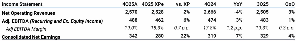 A Marcopolo apresentou resultados do 4T25 levemente acima do esperado, com EBITDA ajustado de R$488 milhões (+3% A/A e +1% T/T). As receitas totalizaram R$2,6 bilhões (em linha com XPe), com um mix favorável compensando níveis menores de câmbio e condições de financiamento ainda desafiadoras no Brasil. A margem EBITDA ajustada (ex‑resultado de equivalência patrimonial) permaneceu sólida em 19,0%, apoiada por uma sazonalidade mais forte e por um mix mais orientado a produtos de maior valor agregado. Ainda assim, alguns itens obscurecem a tendência subjacente, incluindo R$39 milhões em créditos tributários relacionados ao Mover (que vemos como parcialmente recorrentes) e impactos negativos de provisões. Efeitos de câmbio também impulsionaram o resultado financeiro, levando o lucro final a ficar +11% acima do consenso. Olhando adiante, esperamos que a sazonalidade pese sobre volumes e mix de produtos no início do ano. Mesmo assim, recebemos positivamente as indicações do management de melhoria a partir do 2T26E, liderada pelo segmento urbano, com expectativa de aceleração da produção no 2S26 — potencialmente mais ou menos pronunciada dependendo do ritmo de cortes de juros domésticos. Reiteramos nossa recomendação de Compra.