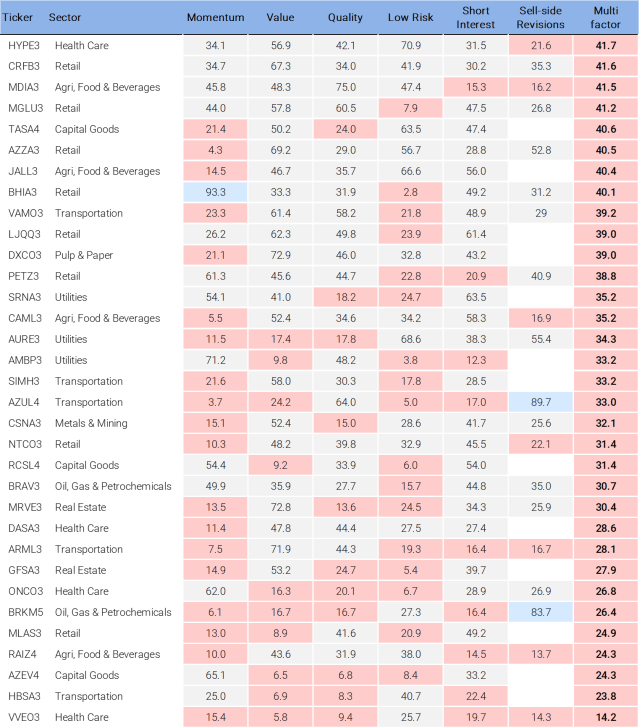 Abaixo, apresentamos a cesta comprada (com as ações com nota do Multifatorial mais alta) e a cesta vendida (com as ações com nota do Multifatorial mais baixa), além dos scores individuais para cada fator proprietário. Quanto mais nota a alta, mais exposta a ação ao fator em questão. O número em azul indica que naquele fator a ação está na cesta comprada, ou seja, está entre as notas mais altas neste critério; já os valores em vermelho indicam que a nota neste critério está entre as mais baixas e, portanto, que ação está na cesta vendida do fator.