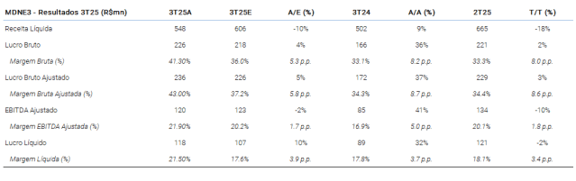 Estamos otimistas em relação aos resultados do terceiro trimestre de 2025 da MDNE. No geral, os lucros continuam a refletir o notável desempenho operacional da empresa nos últimos trimestres, com uma contribuição robusta do segmento de condomínios. Assim, mantemos nossa recomendação de compra para as ações, considerando que o domínio regional da MDNE apoia a continuidade do forte desempenho operacional no futuro, ao mesmo tempo em que acreditamos que o segmento de baixa renda é uma via de crescimento sólida para a empresa.