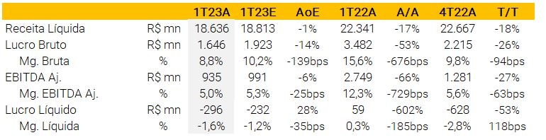 A receita líquida caiu 19% A/A (-6% vs. XPe) impulsionada pela receita de exportação que caiu 31% A/A, apesar de um pequeno aumento de 3% no mercado doméstico. Devido a uma forte queda nos custos do gado não só no Brasil, mas também na Argentina e no Uruguai, a margem bruta aumentou para 13,7% (+360bps A/A e -60bps vs. XPe). Isso levou o EBITDA Aj. a cair apenas 1% A/A para R$ 408 milhões (+3% vs. XPe), traduzindo-se em uma margem sólida de 7,8% (+60bps vs. XPe e +140bps A/A), apesar da falta de demanda da China.