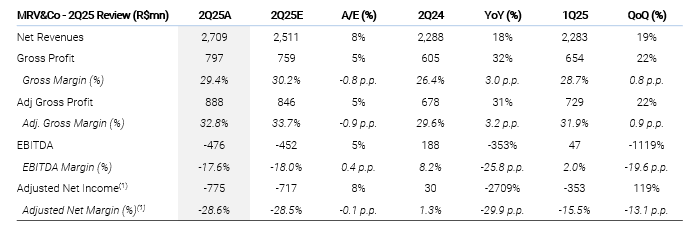 A MRV apresentou resultados mistos no segundo trimestre de 2025, prejudicados pela Resia, embora as operações brasileiras tenham ganhado tração. A MRV Inc. registrou um lucro líquido ajustado positivo de R$ 125 milhões (+65% A/A, +15% em relação ao XPe), apoiado por (i) um sólido crescimento de 21% A/A na receita, (ii) uma expansão contínua da margem bruta de 90 pontos-base, excluindo os efeitos da reversão do PDD, e (iii) despesas SG&A diluídas T/T. Por outro lado, a Resia aprofundou suas perdas para R$ 887 milhões, superando a perda estimada de R$ 826 milhões, principalmente devido a (i) reconhecimentos de impairment (reavaliação de ativos) esperados e (ii) piora nos resultados financeiros e participações minoritárias. Isso resultou em um aumento das perdas líquidas da MRV&Co para R$ 775 milhões, um pouco pior do que nossa estimativa de perda de R$ 717 milhões, apesar das receitas e do lucro bruto terem superado nossas estimativas e as do consenso. Embora o impacto da Resia tenha pesado nos resultados consolidados, o desempenho acima do esperado das operações brasileiras pode desencadear uma reação positiva das ações, em nossa opinião.