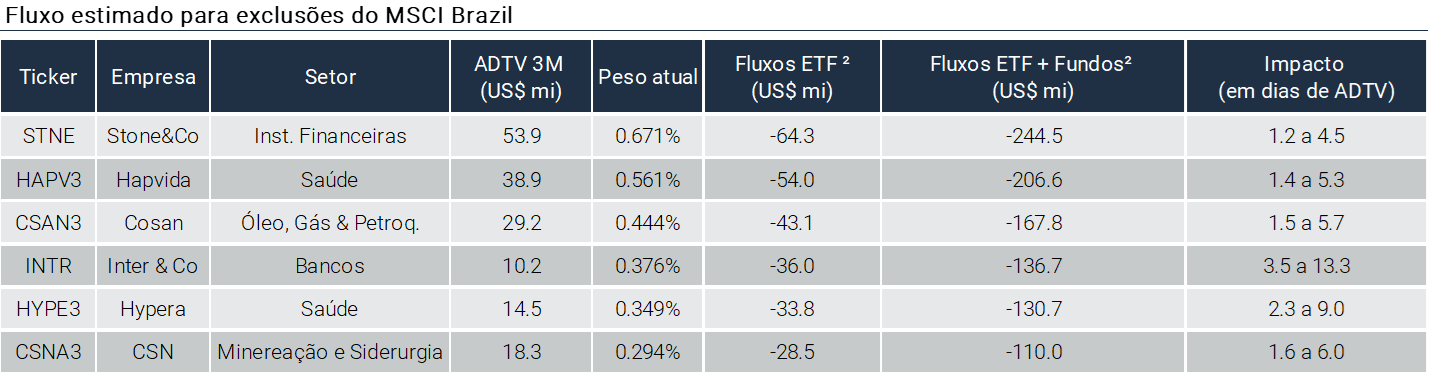 No MSCI Brazil não houve adições, mas serão excluídos 6 nomes: StoneCo (STNE, STOC31), Hapvida (HAPV3), Cosan (CSAN3), Inter & Co (INTR, INBR32), Hypera (HYPE3) e CSN (CSNA3) — dos quais três foram antecipados em nossa prévia. Além disso, o peso do Brasil no MSCI Emerging Markets deve cair para 4,432% dos atuais 4,477%.