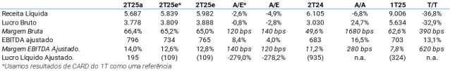 As vendas líquidas caíram 2% ano a ano (+5% em moeda constante), pois (i) Natura Brasil apresentou desempenho sólido (+10% ano a ano) com ganhos de produtividade por preço/mix; (ii) Natura Hispana cresceu 5% ano a ano (+18% em moeda constante, ou dígitos baixos excluindo Argentina), à medida que a Onda 2 começa a impactar os resultados, embora o crescimento da Argentina permaneça forte, contudo desacelerando; enquanto (iii) Avon foi o ponto negativo, caindo 13% no Brasil em meio a um pipeline de lançamentos ainda fraco e -14% na Hispana (-20,5% excluindo Argentina) devido aos impactos esperados da Onda 2; e (iv) Casa & Estilo sofreu impacto negativo na Hispana (-26%) devido à Onda 2, embora tenha apresentado leve crescimento no Brasil (+3%).