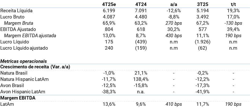 • Prévia do 4T25. No Brasil, esperamos que a Natura siga pressionada pelo ambiente macro mais fraco, com leve deterioração em relação ao crescimento do 3T (para -1% ano contra ano, vs. -0,3% no 3T), enquanto a Avon deve apresentar melhora sequencial, com a normalização da migração da fábrica que impactou o 3T, embora ainda em queda de 12,5% ano contra ano. Na Hispana, esperamos uma melhora sequencial em ambas as marcas, com o México mais próximo de estabilizar suas operações, enquanto a Argentina continua sofrendo com os efeitos da Onda 2. Como resultado, estimamos que a receita da marca Natura diminua 12% em BRL (+13% em moeda constante), enquanto a Avon diminua 38% (-21% em moeda constante). Quanto à lucratividade, estimamos que a margem bruta de produção se manterá saudável, expandindo ano a ano em comparações fáceis (esforços promocionais e maior participação dos presenteáveis no 4º trimestre de 2024) e menor na comparação trimestral em linha com a sazonalidade usual. Enquanto isso, a margem EBITDA Ajustada deve ser um destaque, com despesas SG&A menores levando a uma sólida expansão para 13,0% (Latam em 13,6%). Vale ressaltar que estimamos os custos de transformação em R$80 milhões, sendo este o último trimestre desse impacto. Por fim, o lucro líquido deve ser de R$175 milhões, com ND/EBITDA (excluindo IFRS) em 1,4x.