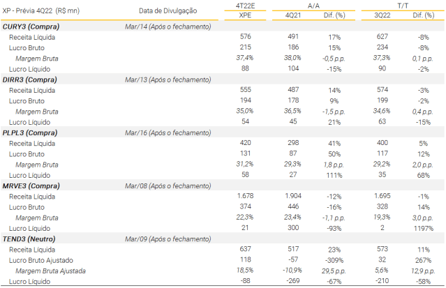 Esperamos resultados positivos para a Direcional no quarto trimestre, apesar dos impactos negativos nas vendas líquidas devido às Eleições e Copa do Mundo. Estimamos uma receita líquida de R$ 555 milhões (+14% A/A e -3% T/T) e uma margem bruta ligeiramente superior, atingindo 35,0% (+0,4 p.p. T/T), auxiliada pela desaceleração da inflação dos custos de construção. Por fim, esperamos que o lucro líquido atinja R$ 54 milhões, aumentando 21% A/A, embora desacelerando 15% T/T, devido à uma comparação mais difícil com o 3T, explicada por uma dinâmica positiva de receita financeira (operações de equity swap) ajudando o lucro líquido naquele trimestre.
