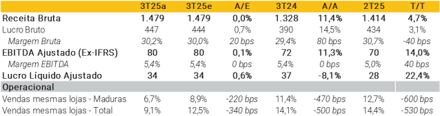 Crescimento sólido da receita apesar dos desafios no atacado. As vendas brutas consolidadas cresceram 11% ano a ano, com o sólido desempenho do varejo (+14% ano a ano) mais do que compensando os impactos da descontinuação do atacado (~2,6% das vendas no 3T24). O crescimento foi apoiado pela expansão orgânica (+51 novas lojas nos últimos 12 meses, 12 fechadas) e por tendências sólidas de vendas mesmas lojas (MSSS em +7%, contra RADL em +8%), com o digital também sendo um importante motor (+42% ano a ano para cerca de 26% do total das vendas no varejo — nível recorde). Por categoria, o destaque foi o RX (medicamentos sob prescrição) com crescimento de 17% ano a ano, apoiado por GLP-1 e tratamentos crônicos, enquanto os genéricos também apresentaram crescimento sólido de 15%. Vale destacar que o crescimento de HPC e OTC (produtos de higiene pessoal, perfumaria e cosméticos e medicamentos isentos de prescrição) desacelerou para 12% em relação ao 2º trimestre (14-24%, respectivamente), embora HPC tenha permanecido ligeiramente acima dos níveis da RD, com o forte posicionamento da marca própria da empresa (~18% das vendas de HPC no 3T; +2,3 pontos percentuais ano a ano) possivelmente explicando esse desempenho superior.