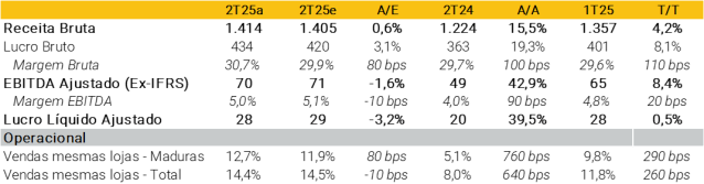 Forte crescimento da receita apesar dos ventos contrários do atacado. As vendas brutas consolidadas cresceram 16% ano a ano, já que o forte desempenho do varejo (+20% ano a ano, +16% excluindo as enchentes no RS) mais do que compensou os impactos da descontinuação do atacado (~3,5% das vendas no 2T24). O crescimento foi apoiado pela expansão orgânica (+58 novas lojas nos últimos 12 meses, 10 fechadas) e sólidas tendências de Vendas Mesmas Lojas (SSS) – Vendas Mesmas Lojas Maduras (MSSS) em +12,7%, contra RADL em +5,5% e PGMN em +17,5% – com o digital sendo um importante motor (+53% ano a ano para cerca de 24% do total das vendas no varejo – nível recorde). Por categoria, OTC foi o destaque com crescimento de 24% ano a ano, apoiado por medicamentos para diabetes, resfriado e gripe e vitaminas/suplementos, enquanto RX também apresentou crescimento sólido (+22% ano a ano), possivelmente impulsionado por medicamentos GLP-1. Vale destacar que o crescimento do HPC desacelerou cerca de 0,7 ponto percentual em relação ao 1T (para 14%), mas permaneceu acima dos níveis dos pares (PGMN em +11% e RADL em +8% no 2T), com o forte posicionamento da marca própria da empresa (~18% das vendas de HPC no 2T; +1,9 pontos percentuais ano a ano) possivelmente explicando esse desempenho superior.