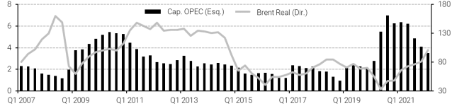 Figura 11: Capacidade excedente da OPEP (Milhões de barris/dia) e preços reais do Brent (US$ 1T22/bbl)