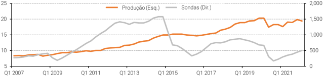 Figura 12: Produção de petróleo dos EUA (Milhões de barris/dia) e contagem de perfurações