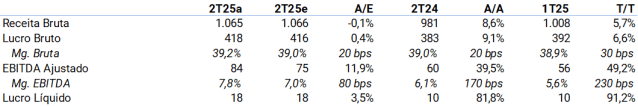 As vendas brutas consolidadas somaram R$ 1,1 bilhão (+8,6% ano a ano), apoiadas pelo crescimento de Vendas Mesmas Lojas (SSS) de 5,5% (-0,5 ponto percentual trimestre a trimestre) e pela abertura de 11 lojas nos últimos 12 meses (nenhuma no 2T). Em termos de canal, o destaque foi o físico (+12% ano a ano), com o setor pet aumentando preços após um ano sem inflação, enquanto o digital cresceu 4,5% devido a bases de comparação fortes e os serviços desaceleraram para +10% (contra +15% no 1T). Um destaque positivo foi o B2B, que retomou o crescimento (+10%) após quedas nos trimestres anteriores.
