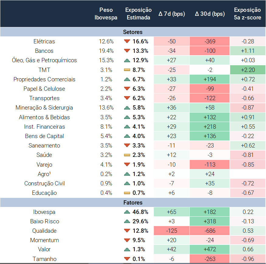 Destaques dos setores: O setor de Elétricas saiu do grupo de setores crowded, com a exposição estimada caindo 3,69 p.p., ficando abaixo da média dos últimos cinco anos. A exposição aos setores de Bancos (-1,00 p.p.), Varejo (-1,13 p.p.) e Transporte (-1,22 p.p.) também diminuiu. A exposição ao setor de TMT manteve-se estável (-0,02 p.p.), mas continua 2,2 desvios-padrão acima da média dos últimos cinco anos e 5,5 p.p. acima do peso no Ibovespa, mantendo seu status de setor crowded. Houve aumentos notáveis em Instituições Financeiras (+2,18 p.p.), Propriedades Comerciais (+1,94 p.p.), Bens de Capital (+1,36 p.p.), Alimentos & Bebidas (+1,32 p.p.) e Mineração & Siderurgia (+0,58 p.p.). TMT, Propriedades de Renda e Papel & Celulose são os setores com maior consenso de posicionamento acima do índice, enquanto Mineração & Siderurgia, Bancos e Instituições Financeiras apresentam posições menores em relação ao índice Ibovespa.