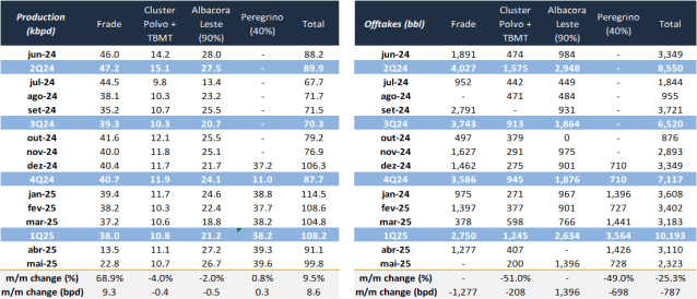 Nossa visão: Apesar do aumento em relação ao mês anterior, a produção de Frade (c.23kbpd) permanece abaixo da produção recorrente esperada (c.35kboed) – ambas amplamente antecipadas com base nos dados de produção diária da ANP. O nível de produção mais baixo é explicado por uma parada programada em abril e uma falha subsequente no sistema de compressão de gás durante o ramp up do campo. A PRIO espera uma resolução em breve. No cluster Polvo + TBMT, a produção continua afetada pela parada de dois poços (TBMT-10H e TBMT-4H) após uma falha em uma bomba. O processo de workover já começou no cluster.