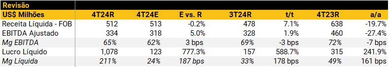 4T24 ligeiramente acima das nossas estimativas. A PRIO reportou resultados do 4T24 marginalmente melhores do que nossas estimativas. O EBITDA ajustado de USD 334 milhões foi cerca de 5% acima da XPe e permaneceu em um nível semelhante ao 3T24 (+2% t/t). Maiores volumes de vendas (+9% t/t) no 4T24 foram parcialmente compensados por menores preços de referência do petróleo (-2% t/t), levando a um aumento de +7% t/t na receita FOB para USD 512 milhões. Por fim, o resultado final de cerca de USD 1,1 bilhão no trimestre (bem acima do esperado de USD 123 milhões) foi substancialmente ajudado por um ganho não recorrente de reconhecimento de perdas líquidas no imposto de renda diferido.