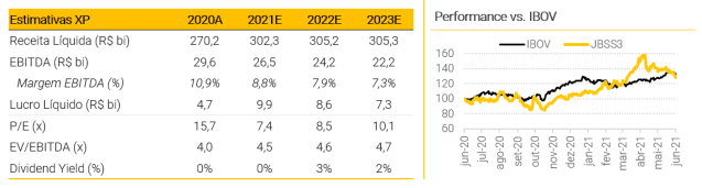 2020 foi um ano forte para a JBS, principalmente por conta da operação de bovinos nos Estados Unidos, além dos resultados da Seara no Brasil. Nesse sentido, para 2021 as perspectivas eram de acomodação: bons resultados, mas tímidos versus o que vimos acontecendo em 2020. A demanda nos EUA, porém, vem surpreendendo positivamente ao longo deste primeiro semestre, principalmente devido aos programas de auxílio diante da Covid do governo norte-americano. Consequentemente, a empresa estaria conseguindo aumentar preços acima do que esperávamos, tanto no caso da carne bovina quanto no das carnes suína e de frango, mais do que compensando o aumento nos custos devido à alta dos preços grãos.