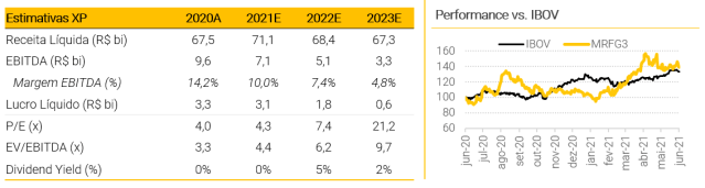 Como comentamos anteriormente, seguimos otimistas com os resultados da Marfrig no 2T21, sobretudo no que tange à sua geração de caixa. Entendemos que a empresa estaria aproveitando o bom momento para a indústria de carne bovina nos EUA, a qual segue impulsionada pela retomada da demanda no país. Adicionalmente, entendemos que a empresa vem se destacando positivamente no que tange às suas iniciativas ESG, sobretudo no campo Ambiental, com propostas de melhorias na rastreabilidade da cadeia pecuária, o que poderia impactar positivamente as ações.