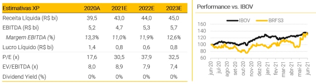 Adicionalmente, é importante destacar que o plano da BRF para os próximos anos, conforme descrito em sua Visão 2030, continua nos trilhos. Prova disso é que a empresa anunciou recentemente a aquisição de uma empresa brasileira que produz ração para pets. Outro ponto importante é que a empresa segue apostando em sua estratégia de produtos de alto valor agregado, o que enxergamos como positivo, uma vez que ajuda a mitigar a alta dos custos da soja e do milho. Por sinal, a acomodação recente dos preços dos grãos também deveria ajudar a melhorar a percepção do mercado em relação a companhia, mas isso também depende da capacidade da BRF em repassar preços para os consumidores ao longo de 2021.