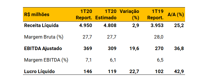 A RD reportou resultados acima das nossas estimativas no primeiro trimestre de 2020 (1T20). A receita líquida atingiu R$ 4,9 bilhões no período, 3% acima da nossa expectativa. O crescimento de vendas no conceito mesmas lojas foi de +15,5% em relação ao 1T19 (+11,5% para lojas maduras), acima da nossa projeção de +12,1% (+7,2%). O desempenho foi suportado principalmente pelo pico de demanda em meio à pandemia do COVID-19, com destaque para as categorias de OTC e Genéricos, que cresceram +46% e +30% em relação ao 1T19, respectivamente.