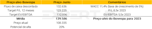 O valor justo para o Ibovespa é calculado como uma média de três metodologias: 1) um modelo de fluxo de caixa descontado (DCF), que atualmente assume um WACC de 11,4%, 2) um modelo de P/E alvo, que assume um múltiplo P/E de 8,5x, ainda abaixo da média histórica de 11x, e 3) um EV/EBITDA alvo de 5,5x, também abaixo da média histórica de 6,5x.