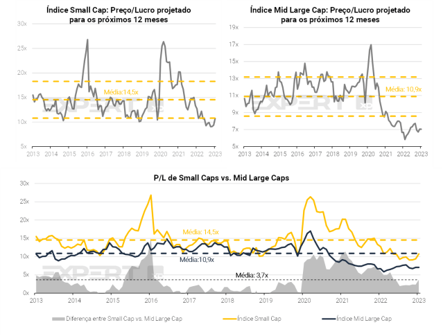 Com um P/L (Preço/Lucro) projetado de 10,8x para os próximos 12 meses, as Small Caps ainda são negociadas com um desconto de 26% em relação à sua média histórica de 10 anos. Em comparação, o índice Mid Large Caps atualmente possui um P/L de 7,0x para os próximos 12 meses, e o índice Ibovespa, de 7,4x.