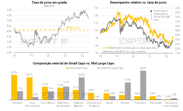 O desempenho sólido das Small Caps, assim como do Ibovespa, é explicado pelas expectativas de taxas mais baixas no futuro. Especificamente, as taxas reais de longo prazo caíram de um pico de 6,5% em março para os atuais 5,6% (ainda acima da média de 5 anos, que é de 4,6%).