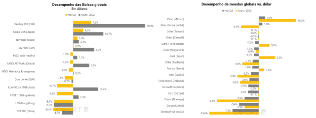 Enquanto isso, os mercados globais tiveram um desempenho ligeiramente negativos, pressionados por preocupações em torno do teto da dívida dos EUA, com o MSCI All Country World (MSCI ACWI) caindo -1,3%. Os índices europeus e chineses também foram pressionados por dados econômicos abaixo do esperado vindos da China. O S&P 500 encerrou o mês com um leve ganho de +0,2%, enquanto o Nasdaq-100, índice americano focado em tecnologia, teve um forte rali de +7,6% impulsionado por ações relacionadas à inteligência artificial, ampliando os retornos do ano para +30,3%.