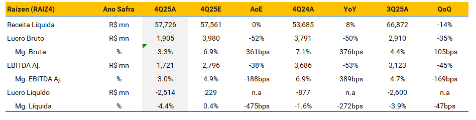 Raízen (RAIZ4) | Revisão de resultados do 4T25: Resultados abaixo do esperado; Processo de turnaround em andamento