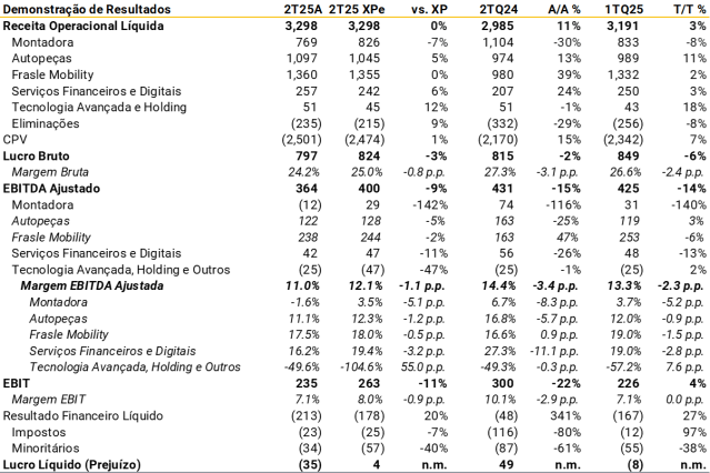 Faturamento. A receita líquida foi de R$ 3,3 bilhões (+11% A/A ou -6% organicamente), com aquisições ajudando a compensar os desafios em geral. Notamos: (i) vendas da Divisão Montadora piores do que o esperado (-12% vs. XPe e -30% A/A), refletindo investimentos adiados em implementos rodoviários (principalmente os modelos relacionados ao agronegócio) em meio a altas taxas de juros, somados a um mix de produtos menos favorável; (ii) melhor desempenho de Autopeças (+13% A/A), com as recentes aquisições e o ramp-up do site da Mogi Guaçu compensando a desaceleração do mercado; e (iii) aumento das receitas de Rands (+24% A/A), refletindo a integração da Delta e a expansão da carteira de crédito. Notamos um melhor desempenho das receitas externas (+92% A/A ou +12% organicamente), auxiliadas pela recuperação das vendas nos EUA e na Argentina.