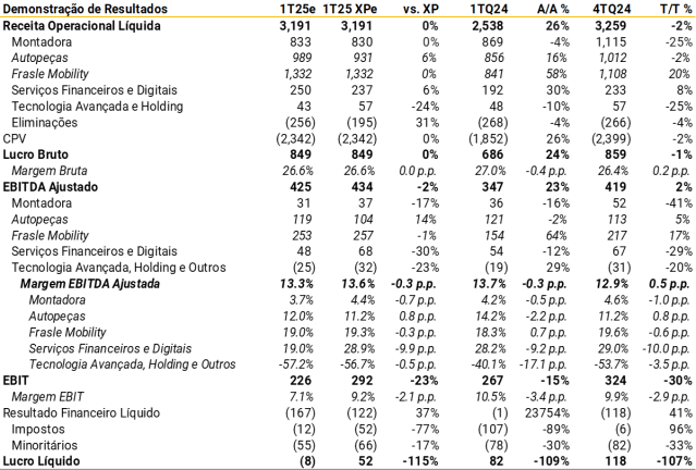 Faturamento. A receita líquida de R$ 3,2 bilhões (+26% A/A e -16% T/T, em linha com dados divulgados anteriormente) foi particularmente beneficiada pelas aquisições; organicamente, a receita teria ficado em R$ 2,8 bilhões, um aumento de +8% A/A. Notamos: (i) condições desafiadoras de demanda por implementos rodoviários relacionados ao agronegócio parcialmente compensadas pela melhoria das vendas nos mercados externos, com receitas OEM caindo -4% em relação ao ano anterior; (ii) Receita de Autopeças melhorando +16% A/A, beneficiada por aquisições e ramp-up da Castertech em Mogi (que contribuiu para R$ 25 milhões de receitas no 1º trimestre); e (iii) vendas sólidas da Frasle (novamente), independentemente da integração da Dacomsa (veja nossa análise completa aqui).
