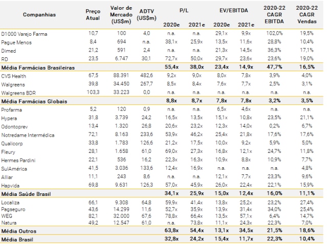 Não se surpreenda com as margens de curto prazo – você deve investir para agregar valor. Embora estejamos otimistas sobre as iniciativas do RD para adicionar valor, destacamos que elas tem um custo. Esperamos que as margens brutas diminuam devido ao aumento da participação digital, juntamente com o novo programa de fidelidade Stix da RD, enquanto não esperamos diluição das despesas gerais e administrativas devido aos investimentos na plataforma de saúde da companhia. No entanto, a alavancagem operacional deve ajudar a sustentar as margens EBITDA em 2021 e 2022 em 7,2% (em linha com 2019 e 0,5 pp acima de 2020).