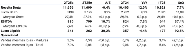 Margem bruta pressionada, mas compensada por eficiências em SG&A. A margem bruta foi o ponto negativo, caindo 0,8 p.p ano a ano, devido a vários ventos contrários, principalmente: (i) -0,4 p.p pela menor CMED; (ii) -0,4 p.p pelo maior peso dos medicamentos GLP-1; e (iii) -0,2 p.p por efeitos como maior competitividade. No entanto, a empresa conseguiu compensar parcialmente esses impactos com forte diluição em SG&A (-0,5 p.p ano a ano) devido à reestruturação corporativa em abril e ao rigoroso controle de despesas. Além disso, as despesas com vendas chamaram atenção, subindo apenas 0,1 p.p como percentual das vendas ano a ano (contra +0,7 p.p no 1T), apoiadas pela alavancagem operacional e eficiências logísticas, enquanto o HC/loja apresentou leve redução trimestre a trimestre (-1%), mas permaneceu estável ano a ano (19,9 funcionários por loja). Como resultado, o EBITDA ficou 11% acima da nossa estimativa, enquanto o lucro líquido ajustado (excluindo um ganho tributário positivo de R$62 milhões) superou nossa projeção em 30%, principalmente devido a melhores resultados operacionais. Por fim, o fluxo de caixa livre foi positivo em R$37 milhões, com melhora na dinâmica do capital de giro, principalmente devido aos estoques.