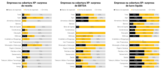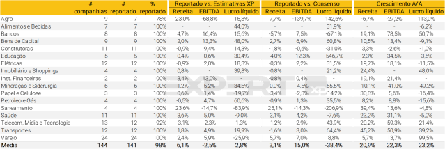 Em média, as receitas reportadas superaram as expectativas da XP em 6,1%, enquanto o EBITDA ficou abaixo em -2,5%. Além disso, o lucro líquido ficou 2,8% acima das expectativas.