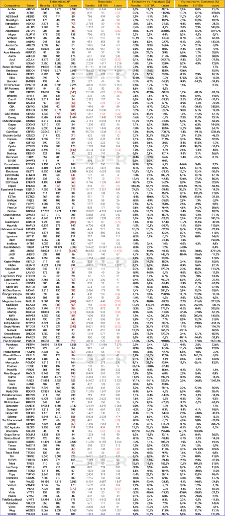 Veja abaixo a comparação entre as expectativas e os números reportados para cada uma das empresas que divulgaram seus resultados e fazem parte da nossa cobertura.