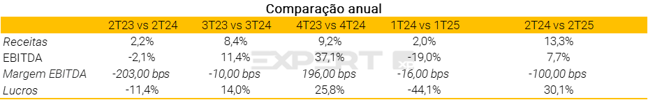 Olhando para o crescimento A/A consolidado, vimos avanço tanto em receitas quanto em lucros: a receita apresentou crescimento de 7,8% enquanto o lucro líquido cresceu 22,5% vs. o 2T24. Já os Cíclicos Domésticos apresentaram crescimento em todas as linhas, incluindo EBITDA de dois dígitos. Em relação ao Ibovespa, todas as métricas apresentaram crescimento A/A: receita de +13,3%, EBITDA de +7,7% e lucro líquido de +30,1%.